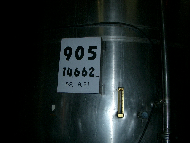 ちょっと暗くて分かりにくいのですが、このタンクの中で、ワインを熟成しています。「902」の数字の下を見てください。14713リットルです!すごい量ですね!!この大きさのタンクが並んでいます。